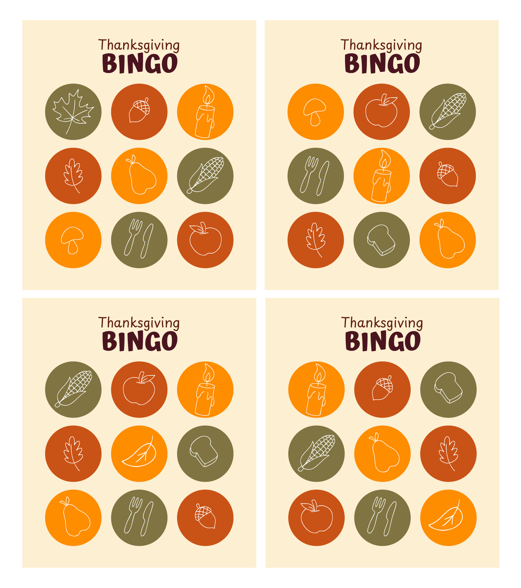 You can use small items like candy corn or acorns as markers for the game. Then, simply call out the Thanksgiving-themed images on the sheets, and players can mark them off as they are called. The first player to get five in a row, whether horizontally, vertically, or diagonally, yells "Bingo!" and wins the game!