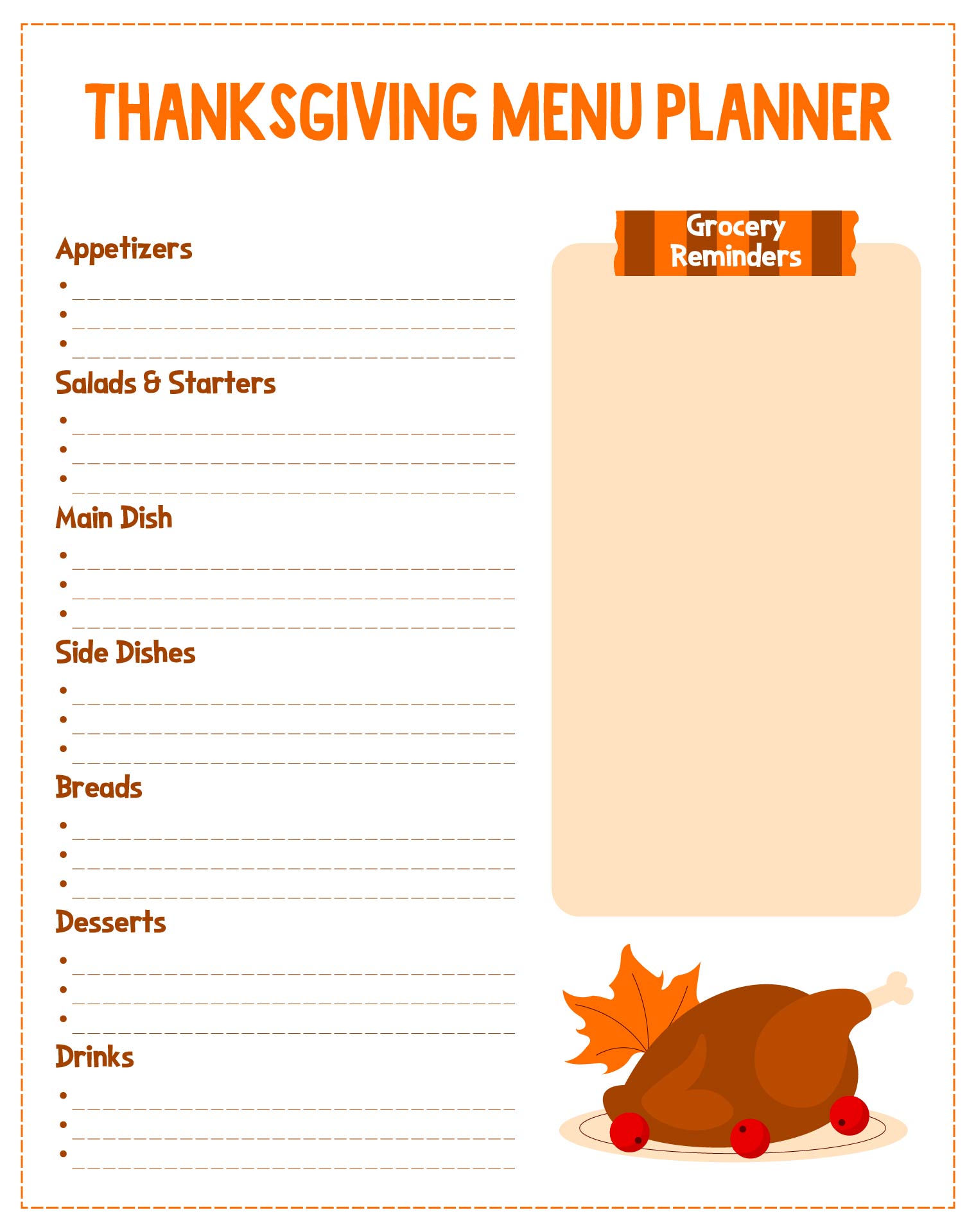 - Functional and Easy-to-Use Features: Thanksgiving dinner printables include functional and easy-to-use features. They feature elements like clickable checklists, customizable sections, and ready-to-print recipe cards. These features make it easy for users to customize the printable to suit their needs and keep track of their Thanksgiving dinner planning.