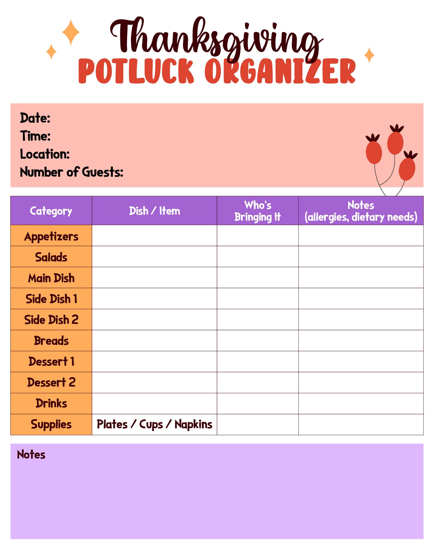 Thanksgiving Potluck Organizer Printable