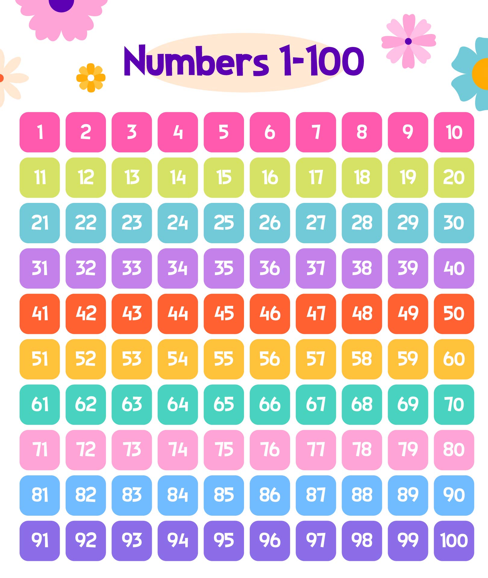 - Counting Skills: By using these charts, students can practice counting from 1 to 100 in a structured and visual manner. This helps in developing a strong foundation in numbers and sets the stage for more advanced Math concepts.