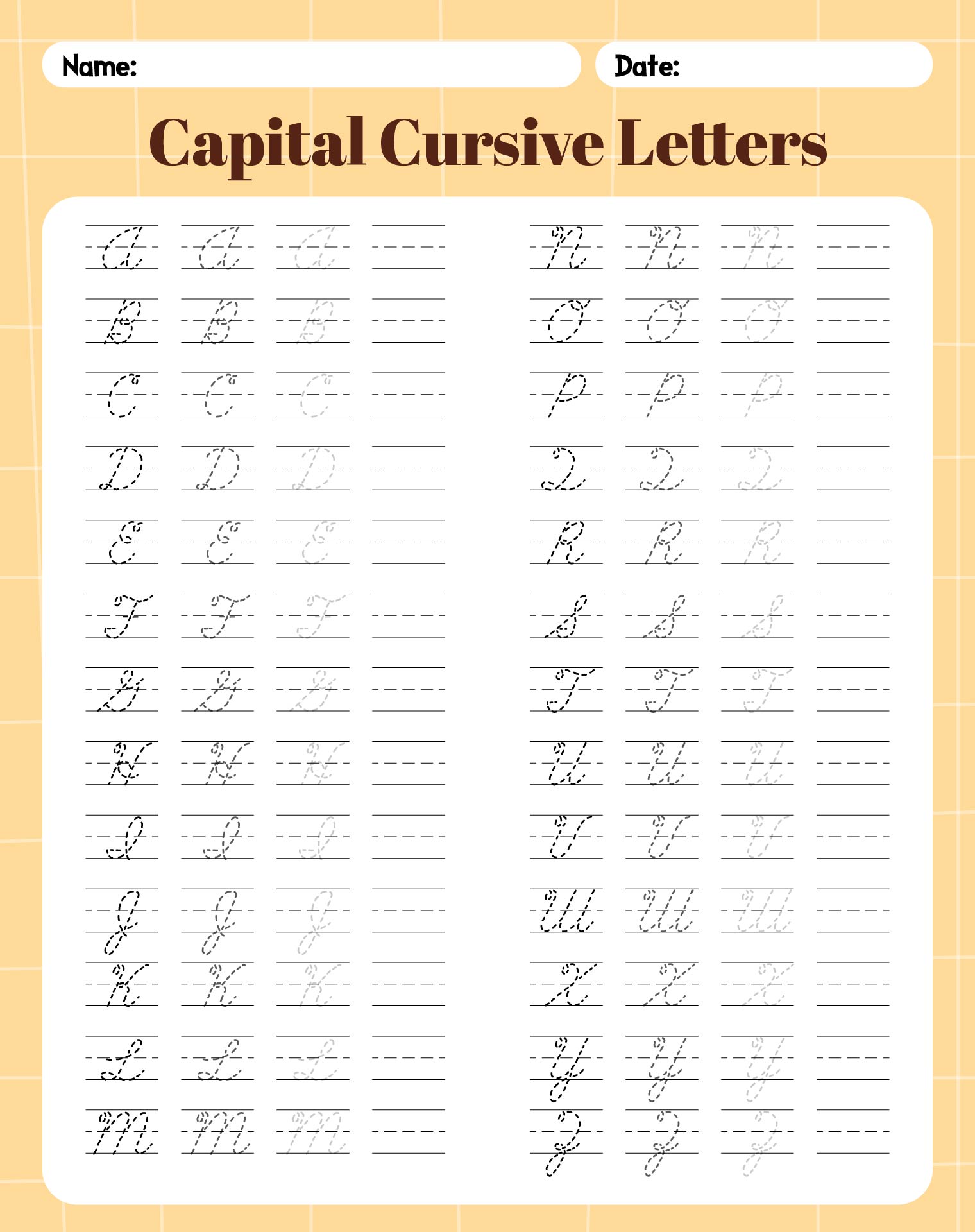 - Capital Letters (A-Z): These are the uppercase letters of the alphabet written in cursive form. They are often used at the beginning of sentences or proper nouns.