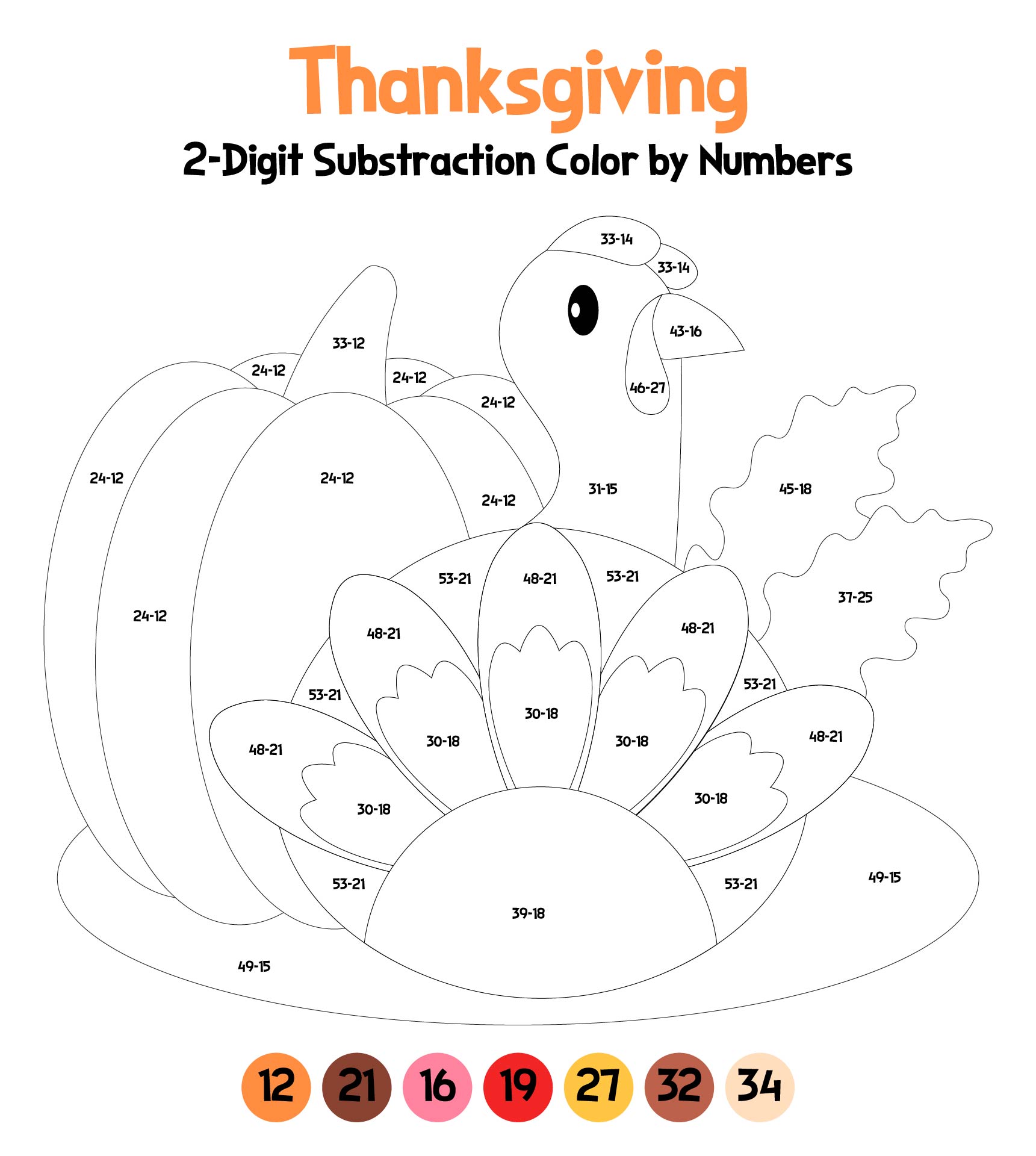 Thanksgiving 2-Digit Substraction Color By Numbers
